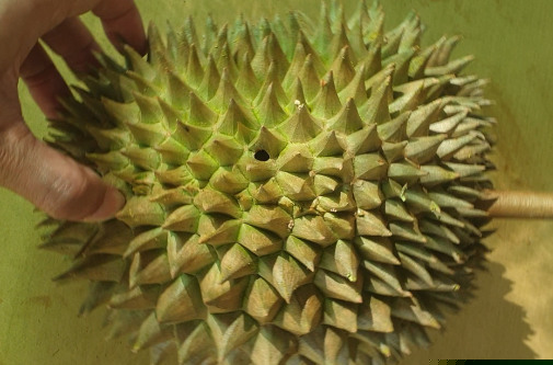 When you discover a worm hole and would like to stretch you luck, you can try gently blowing into the hole and listen for a hollow sound created by the wind. If the sound is present, then it means that the worm has indeed penetrated the husk and using the pod as a bnb. However, if there is no hollow sound and you feel your breath bouncing back at you, then it could mean that the worm did not penetrate the fruit. It could still be a good durian. But I’d still just pick another one.